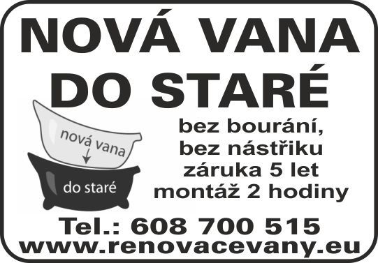 Přestavujeme Vám nejlepší možný způsob renovace Vaší poškozené vany. Tento systém umožňuje použití vany za 24 hodin po montáži. Celková renovace trvá 3 hodiny a je zcela bez bourání a poškození obkladu. Součástí renovace je rovněž výměna sifonu a silikonová protiplísňová lišta okolo vany. Vana je vyrobena z kvalitního 100 % akrylátu který disponuje stálou barevností, vysokou pevností, dlouhodobou životností a výbornými tepelně-izolačními vlastnostmi. Oproti akrylátovým vanám s jádrem z ABS mají tyto vany o mnoho silnější vrstvu akrylátu minimálně 7 mm. Při poškození se tedy velmi jednoduše akrylát obrousí a vana může dále sloužit. Poskytujeme záruku 5 let, avšak životnost akrylátové vany je prakticky neomezená. Více informaci naleznete na: www.renovacevany.eu